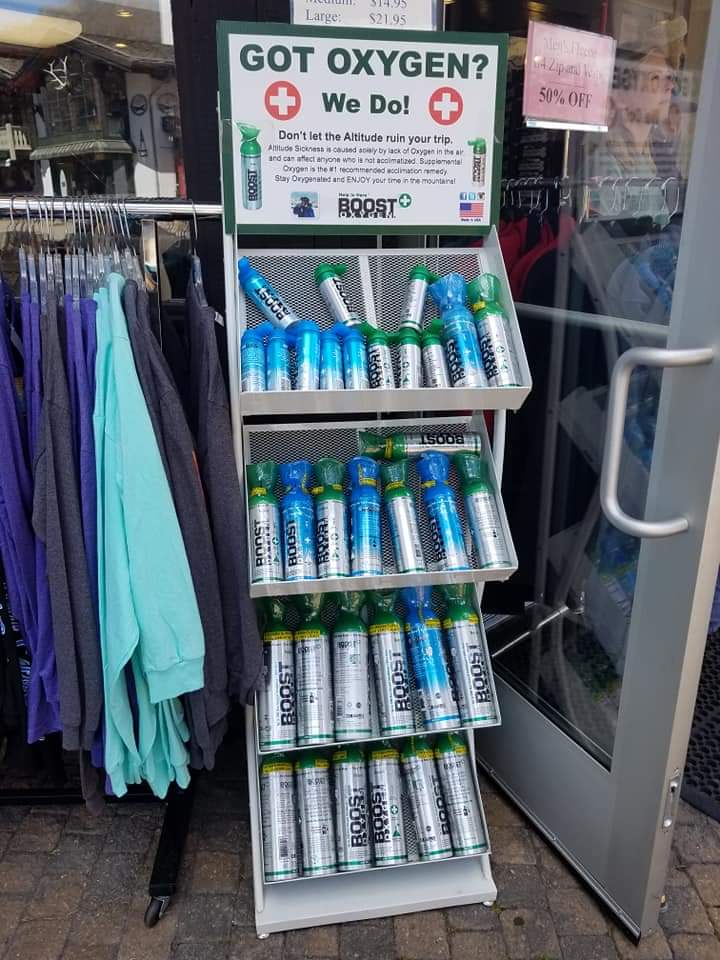 I spent the last week on a working vacation in the Rocky Mountains, so I got to experience walking around at altitude. Even though I live at altitude, the air gets much thinner the higher up you travel. First Reader and I noticed something we hadn’t seen on any of our ski trips in the past—the resorts are now selling bottles of Oxygen, as in O2, in three convenient sizes.