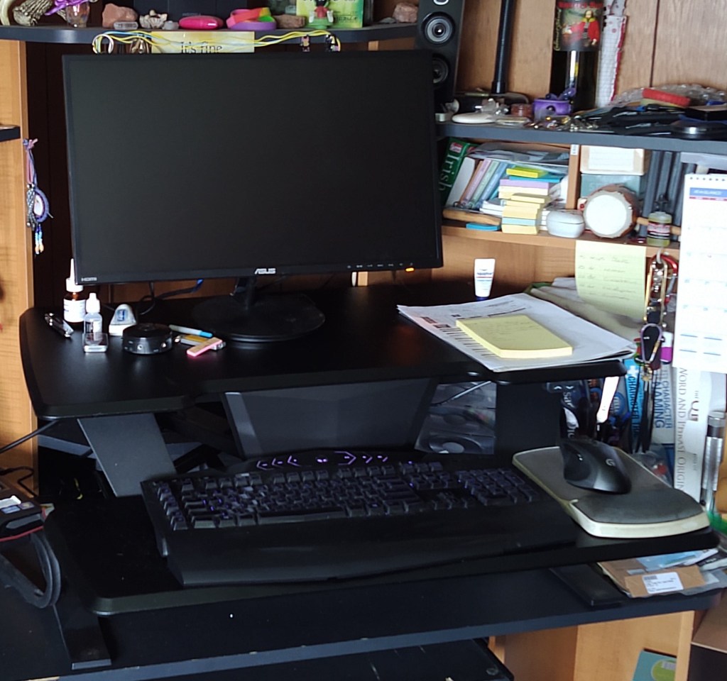 When I finally had the money, I chose the Varidesk ProPlus™ Electric desk. Why this desk? I looked for sit-stand desks at the local office supply stores for a couple of years to no avail. I got a good deal on a moderately-priced desk that should fit my needs for a while. I do still need to make an adjustment, but that will come in time.