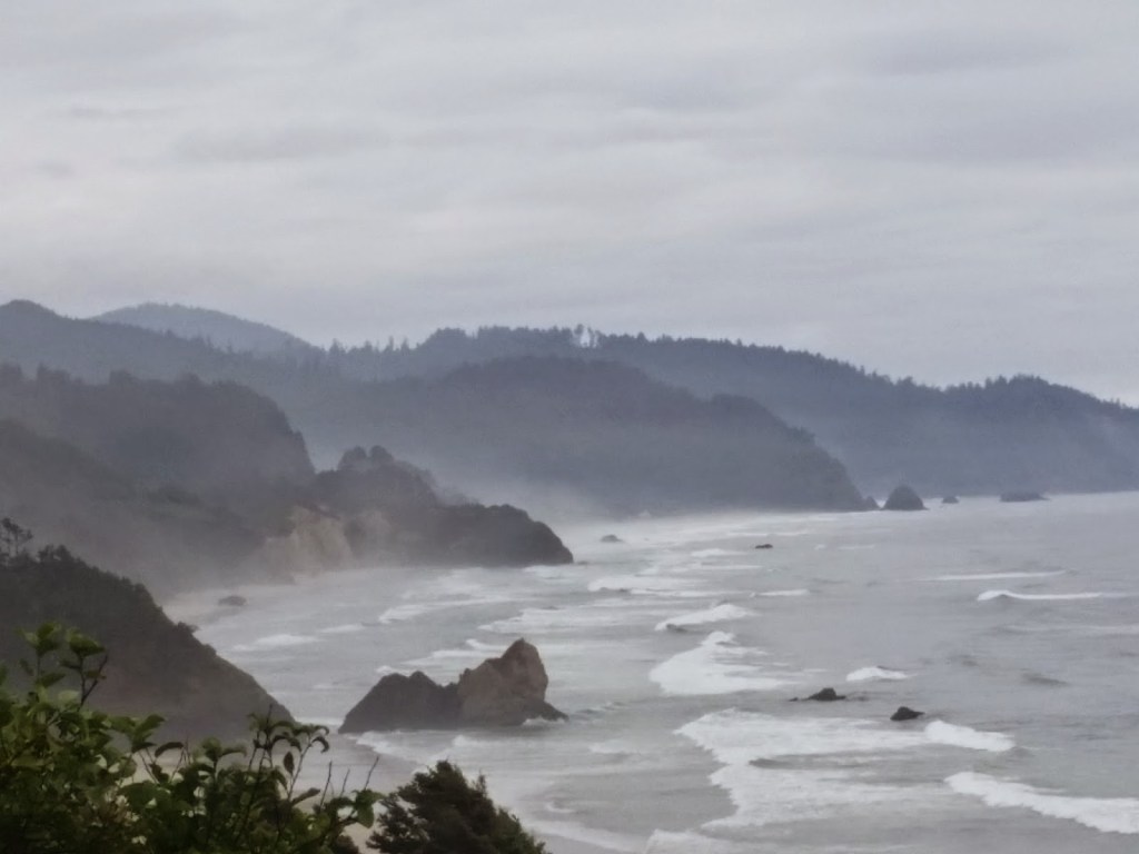 The road was narrow, curvy, and damp. I wasn’t about to go down because someone in a car kept trying to push us along faster. Besides, it was the first trip with the new, bigger bike, I was still getting used to the balance. The highway didn’t have many paved turnouts for slower traffic, and I would usually see a place as I came around a blind corner. We passed a lot of places we could have turned into had we had a warning. Our goal for the day was Lincoln City, OR, where we planned to stay for a couple of days and visit a friend who had moved to Portland.