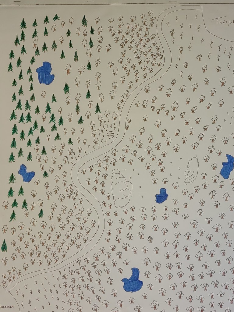 Sometimes, when I can’t think of what to write, I’ll turn to the other creative exercise that helps me “see” the story—the map. I showed a partial map, but have since expanded on the original. Again, it’s not quite complete, but I’m getting there. I just need to find a few more crayons.