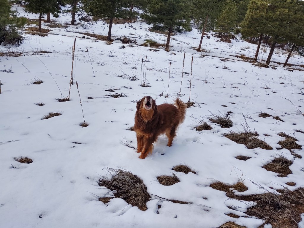 Because I have no idea what lives over there, I made sure I was armed. Somewhere on the mountain, lives a bear (seen it), a bobcat (seen it, too), a mountain lion (haven’t seen it, but it’s seen us), a pack of coyotes (hear them hunt), and other wildlife I probably don’t know about. Not anything I want to encounter while out on my own. And for all I know, the bear den is on our property, so I took the dog with me. He wasn’t happy.