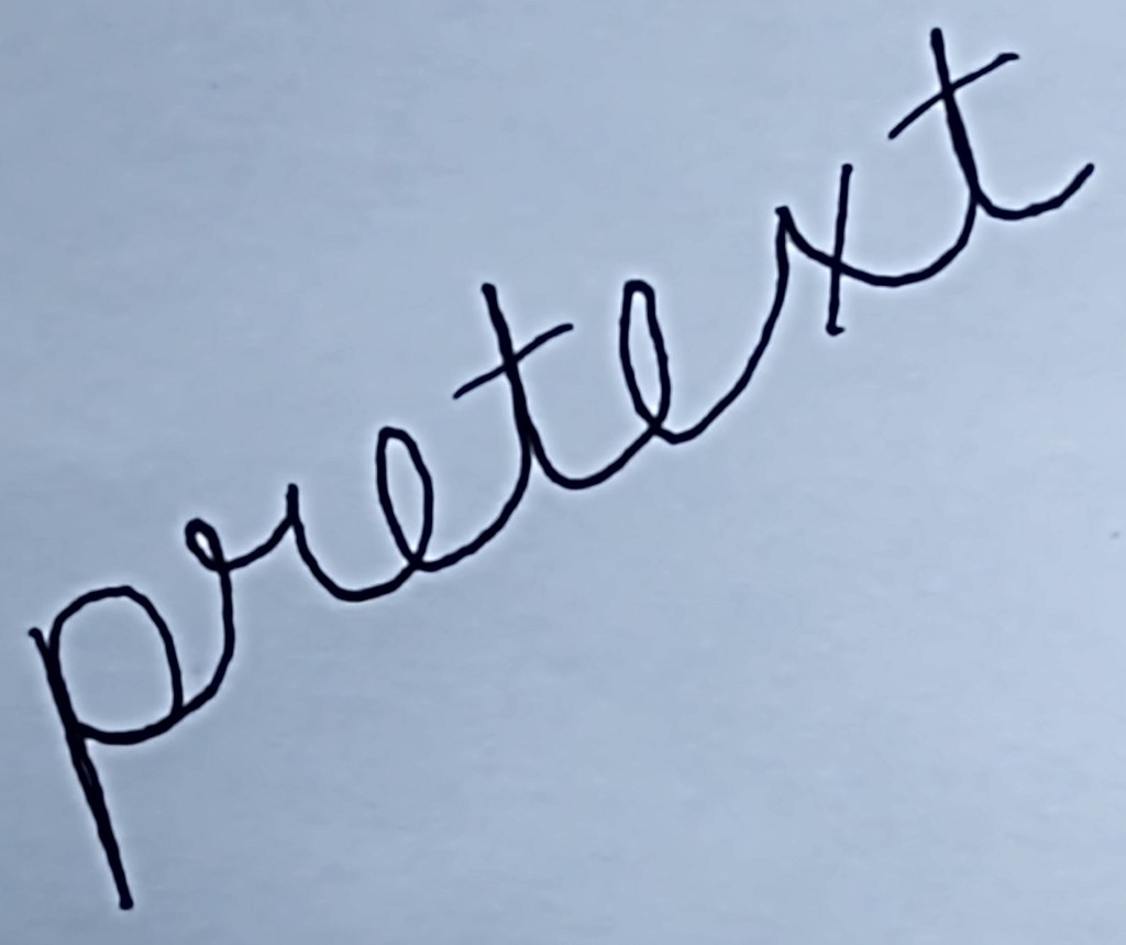 This word was first used around 1538 as the meaning in Definition 1. It comes from the Latin praetextus, from praetexere meaning to assign as a pretext, screen, extend in front, from prae– + texere to weave.