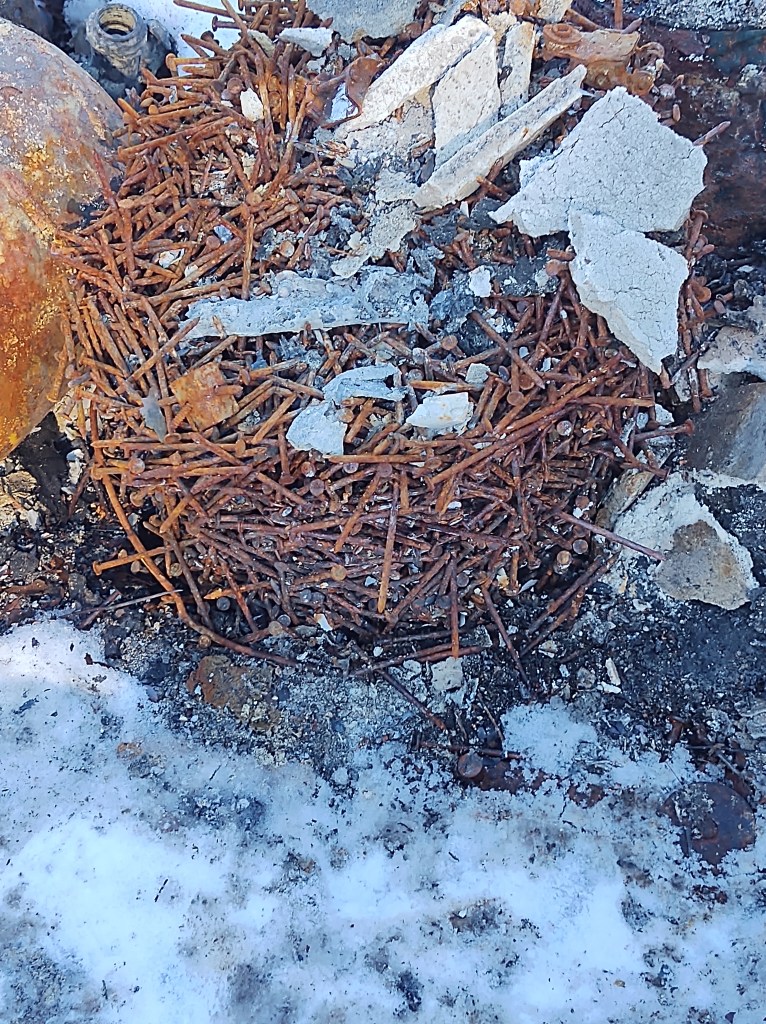 Yesterday, we traveled up the mountain to view the remains and look with an eye to clean up and rebuild. First Reader and her grandson picked through the rubble and found a collection of tools, hitch parts, and tire chains that will soon adorn the walls of the first outbuilding we plan to erect. One of the more exciting finds was what used to be a bucket of nails—sans the bucket.