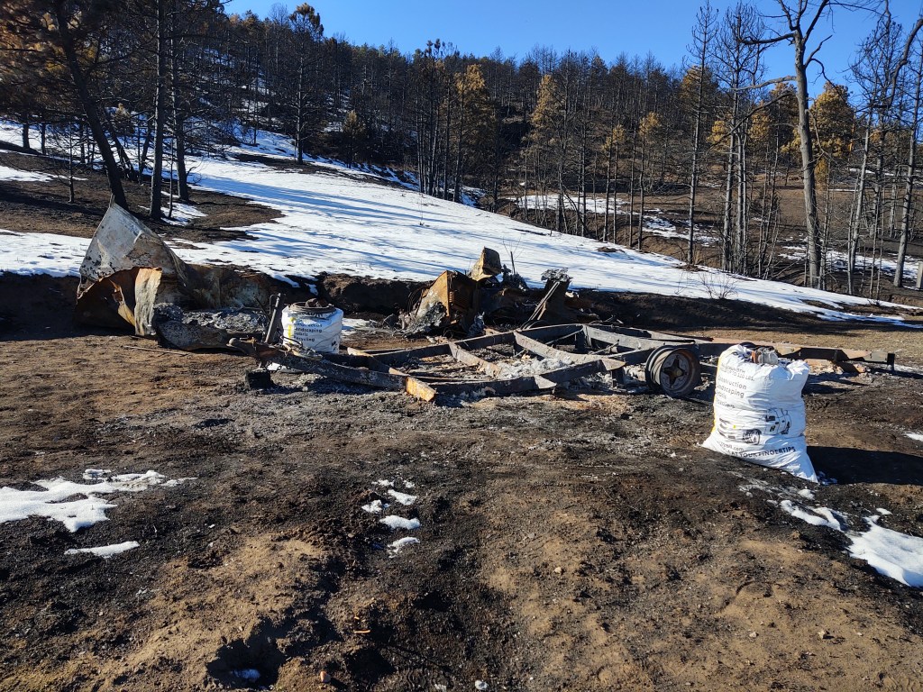 The job didn’t take us as long as we thought it would. It helped that the weather was gorgeous for December in the Rockies. The three of us managed to almost fill two construction debris bags in just a couple of hours. We moved the melted aluminum and burned appliances off to the side, then began raking up what was left.