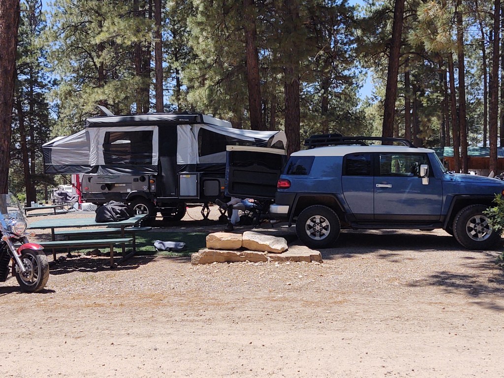 We arrived at our campsite Friday afternoon as planned, then argued with the pop-up camper, trying to get it set up correctly. This is the second time we raised the lid since we got the new motor installed, and it decided to quit rising before the top was fully extended. The motor worked as designed bringing the top back down, but lift it to where it needed to be? Oh, hell no. We spent the next forty minutes manually moving the gears to get the top where it needed to be—what a pain in the keester.