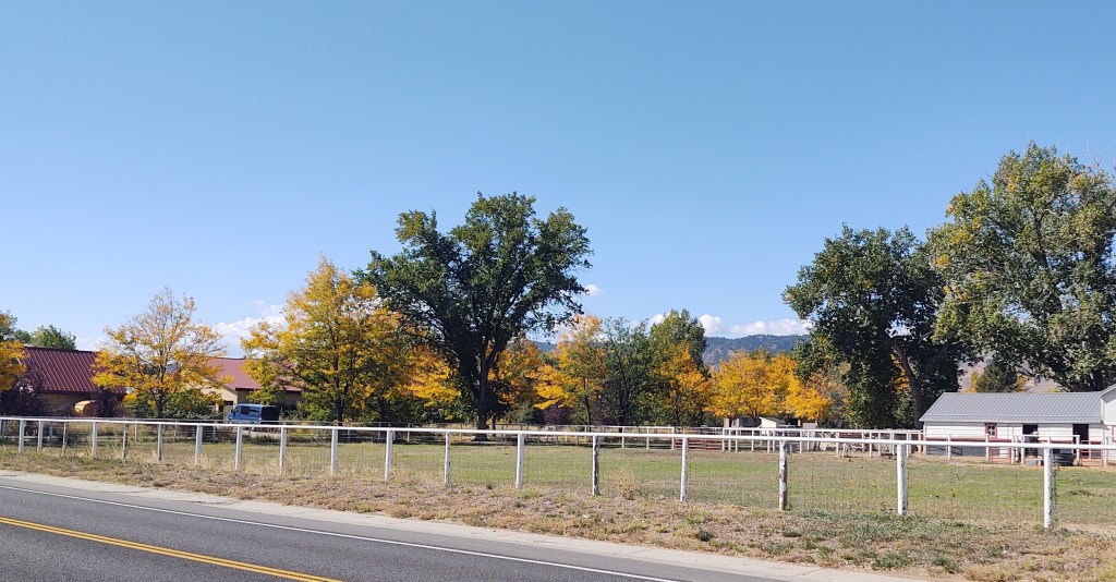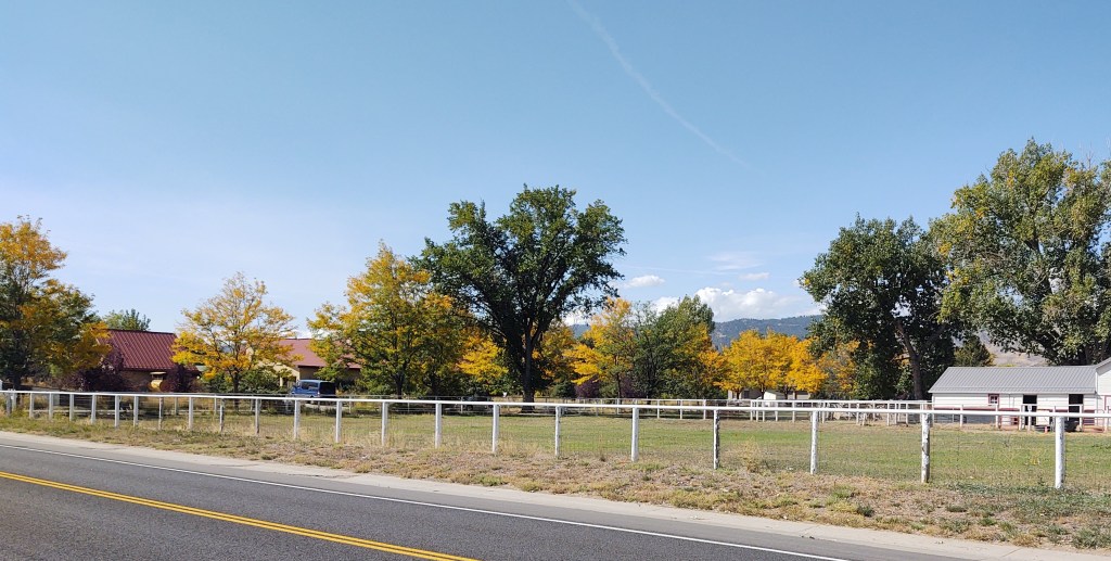 Now that the equinox has passed, I’ve noticed that the palette of my daily walk has changed accordingly. This week, I’ve seen more yellows and golds mixed with the green of the foliage. It won’t be much longer, and the trees will be bare. Most days, my dog walks me along almost the same route, so I tried to get a shot (from roughly the same spot) of the trees across the road.