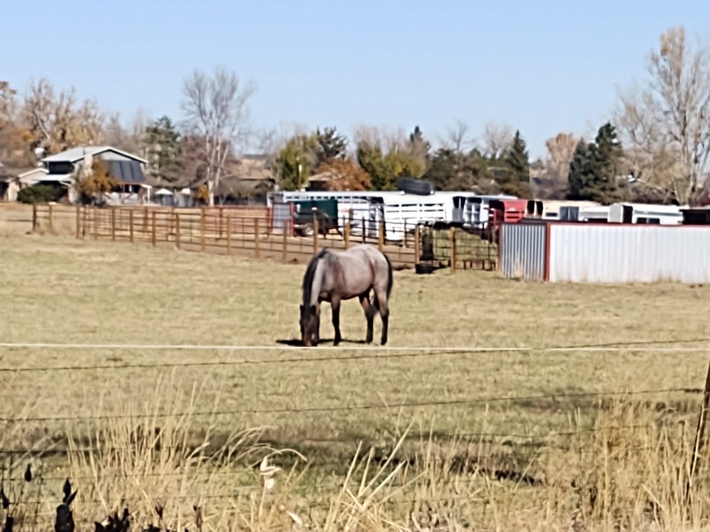 Sometimes, I walk by the big pasture, and a group has been let out to graze. One day this past week, they had just been let out and were frolicking at the far end. It was a sight to see eight to ten horses running and playing. I wish they had been closer; I would have filmed them. But from the other end of the pasture, all that would have been seen were black and brown dots changing position. I did manage to get a picture of them another day, though.