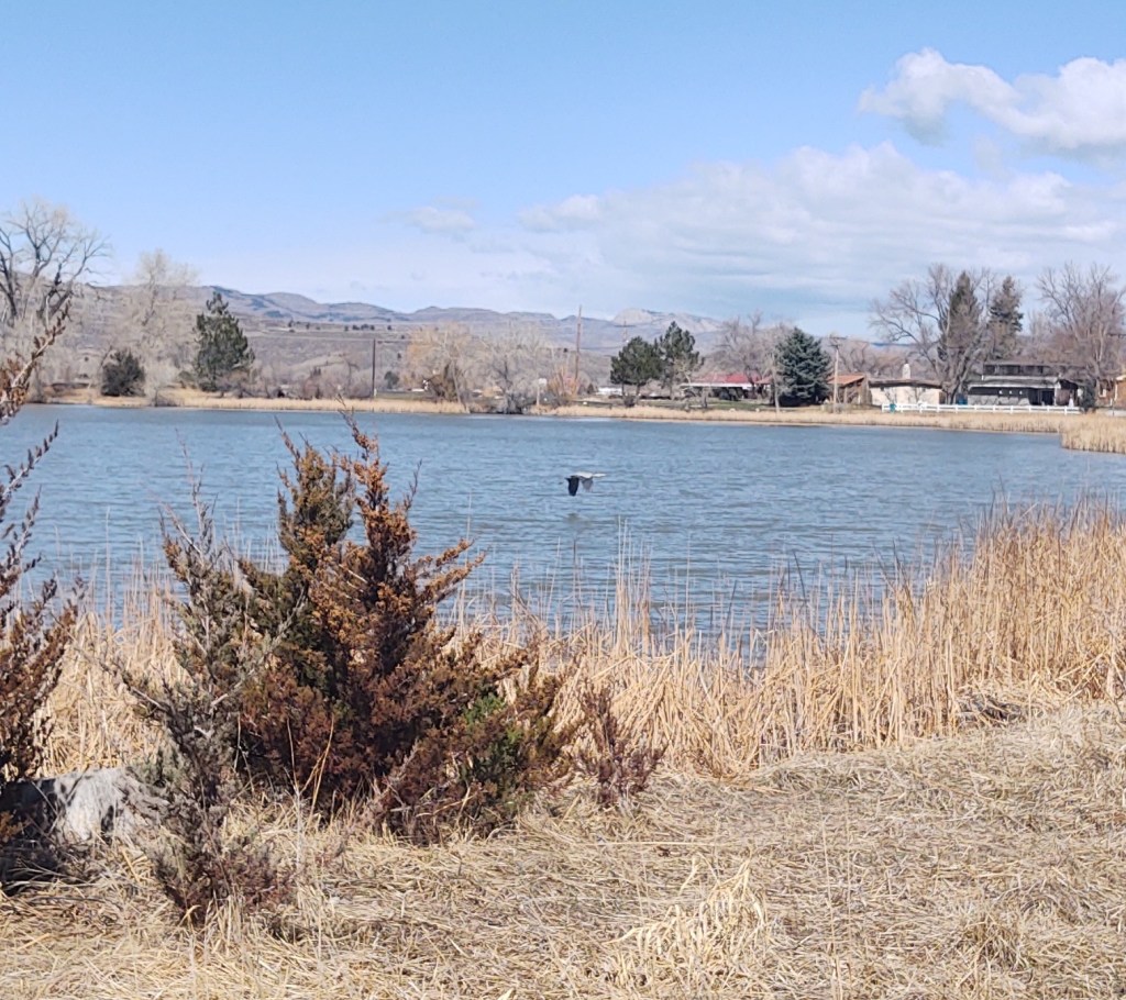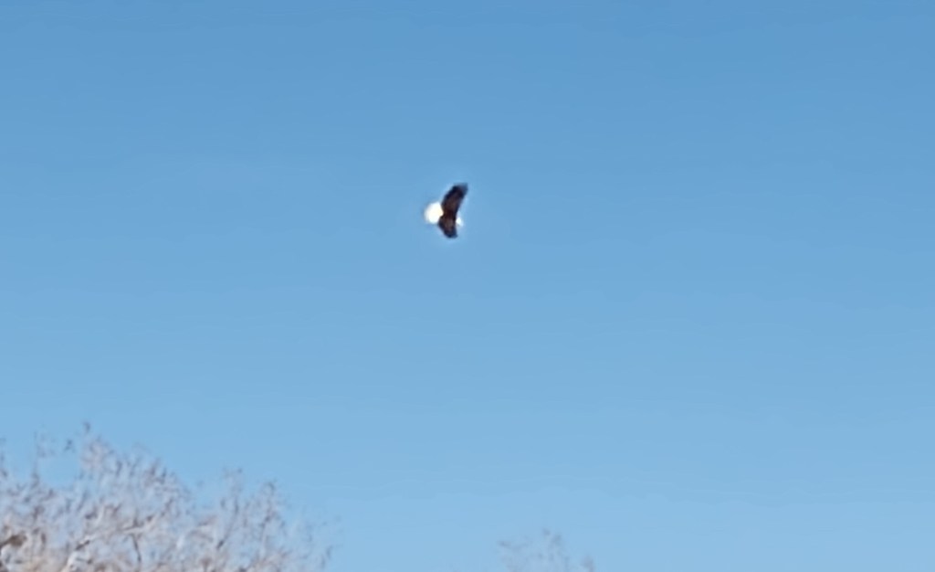 My pup drags me around a nearby pond most days, and I’ve noticed the variety of birds is increasing as the temperatures rise. A month ago, I only heard Mourning Doves and passed the wood ducks and Canada geese while walking the dog. This week, I’ve seen a few fat red-breasted robins, a bald eagle pair, a Great Blue Heron, red-winged blackbirds, and various sparrows and wrens. Had I been in a different area of the pond, I would have snapped a picture of one of the eagles snatching a fish from the water. By the time I got my phone out of my pocket, the bird was out of sight. I managed to capture at least one blurry shot of an eagle in flight after reaching a clear area.