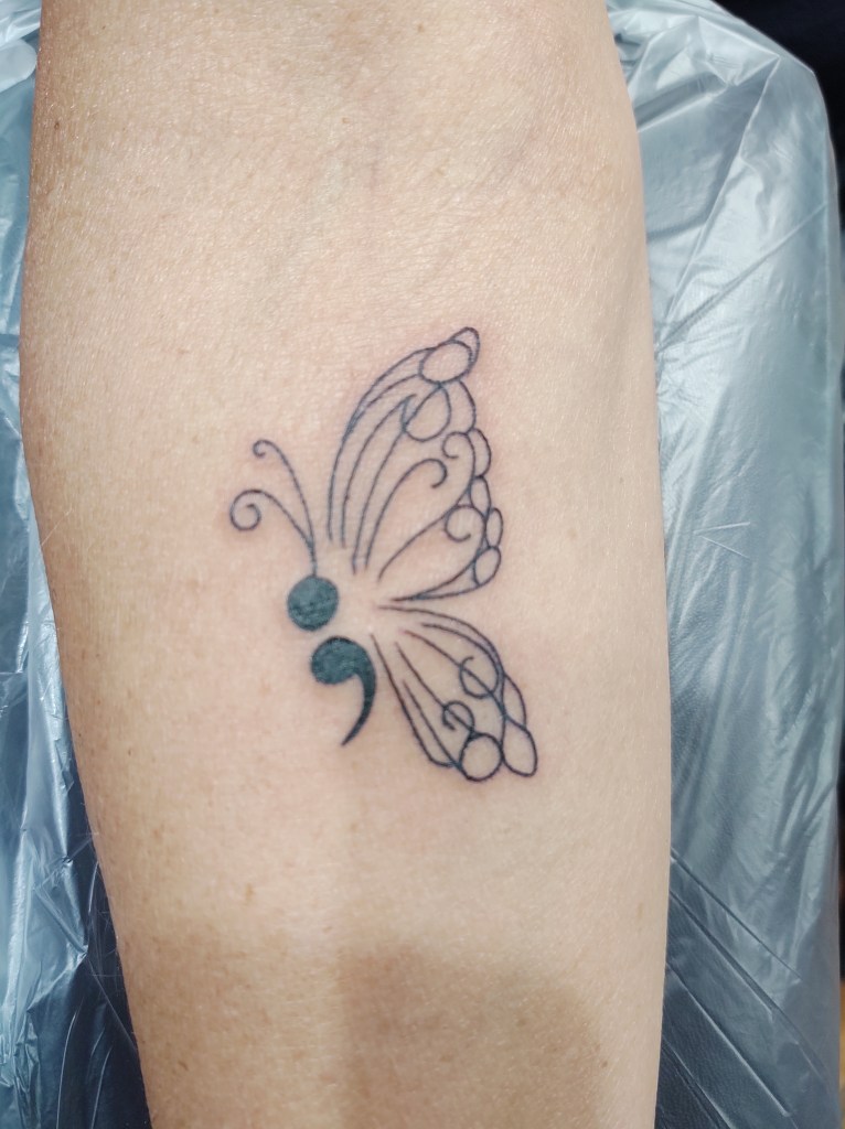 And today’s photo? I got that done in honor of Suicide Prevention Day in 2019. The semi-colon is symbolic of a story not yet complete that more is yet to be written. The butterfly symbolizes change and natural growth, telling us that we can continually evolve and grow into something more than we already are.