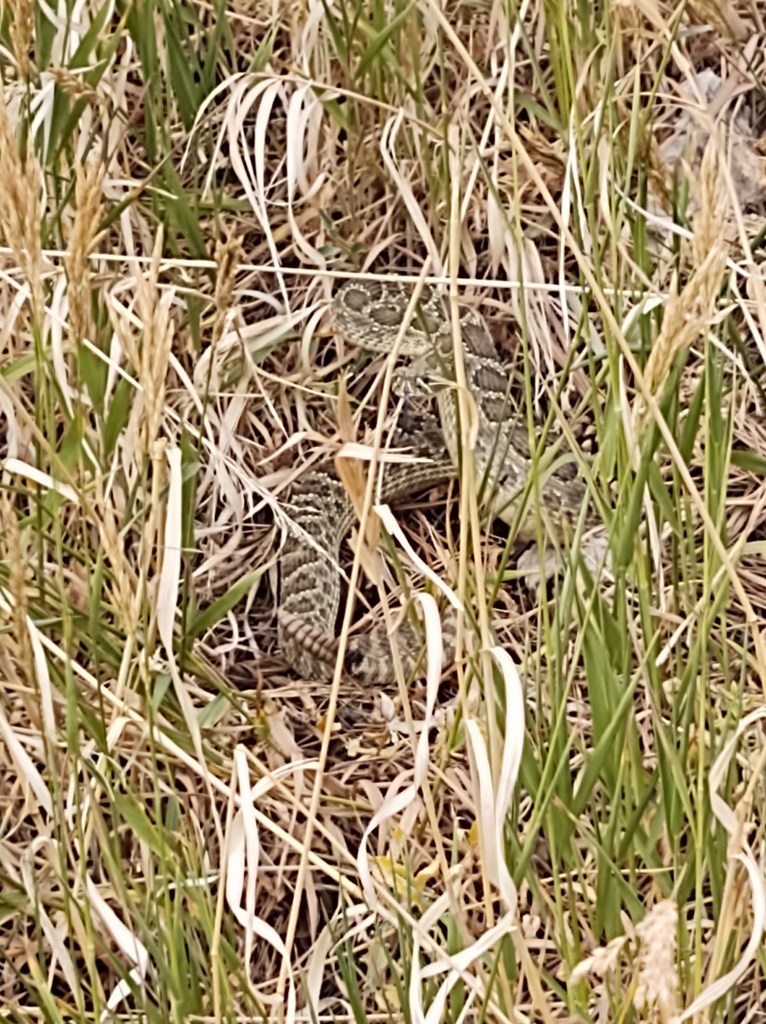 We did make it up one day this week to whack some of the more noxious weeds and talk to our contractor, G.H., about the cistern. As we trekked up through the grass, G.H. and I were brought up short by this guy napping in the shade. It wasn’t hostile; it just wanted to be left alone. It warned us off but never struck, so we left it be.