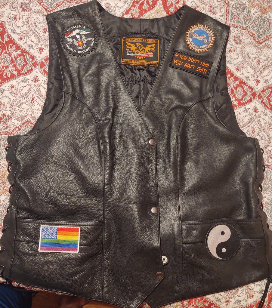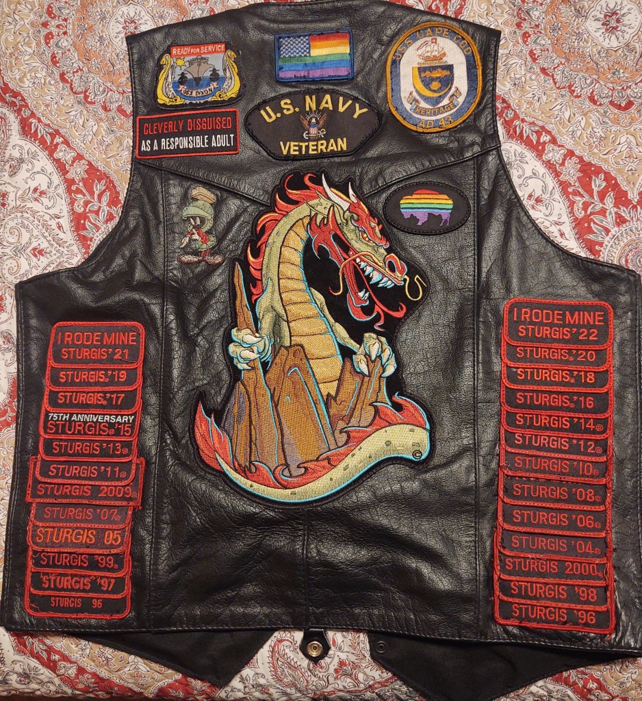 We’ve been running our butts off the last couple of days. On Tuesday, we rode to Sturgis to get the missing vest patches. I only needed a couple of the “I Rode Mine” year patches, but First Reader needed a lot more than I did. We headed back to Black Hills Harley-Davidson when we were done shopping and had the Patch World vendor sew them all on. An arm and a leg later, my vest looks like this: