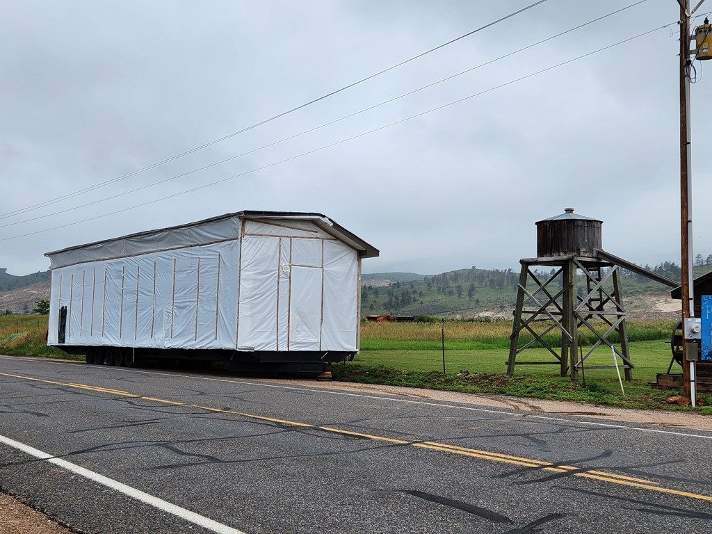 On Wednesday morning, I received a phone call from one of the road association members, Allan. He’s been in touch with all the players in our little mountain drama. Allan knows all the questions to ask, as he’s been the point of contact for several of our neighbors who have rebuilt with modular homes. He let me know that the trucking company transported the halves of our house from their temporary home to the bottom of the mountain. That trek took several hours and likely impeded traffic in several small towns and a couple of larger ones along the way.