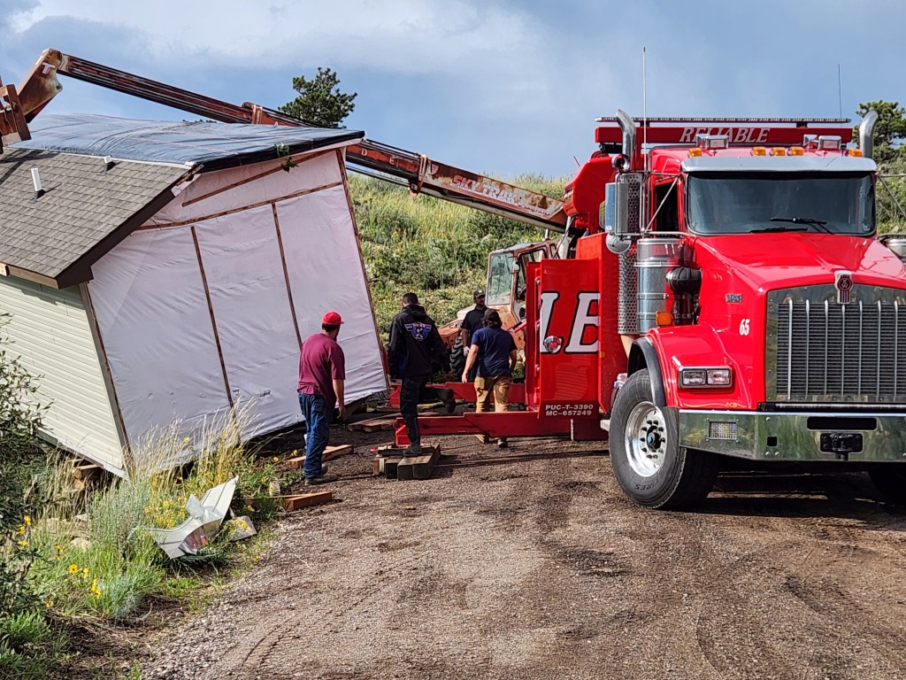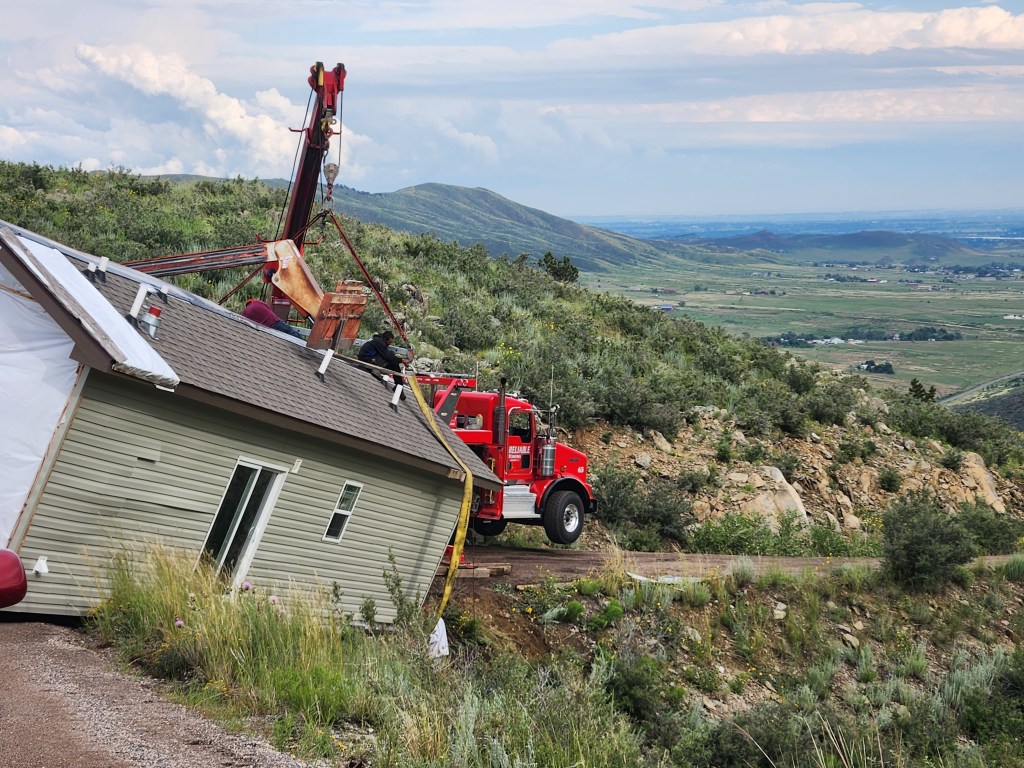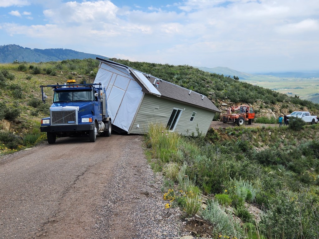 Our mountain is tough on a good day towing a small water trailer. I can’t imagine how nerve-wracking the drive was hauling half of a house behind your semi truck. A one mile stretch of the road is the worst. It’s a windy, steep climb with several sharp curves. Better yet, it’s on the west side of the hogback where the edge drops off a few hundred feet. As the driver negotiated the turn, the downhill side of the trailer began sliding off the edge.