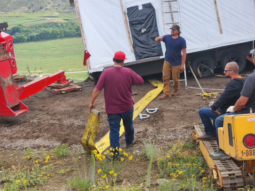 The crew arrived around mid-morning and pulled the living room up to where we had parked the other half for the night. A few cars headed up and down the mountain at that point. The dump truck carrying the recycled material I had ordered followed the train. We needed to add some solidity to our muddy area. That’s where the crane will park to pick the halves up to set them on the foundation.