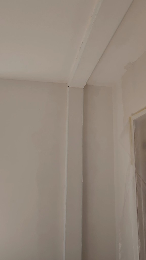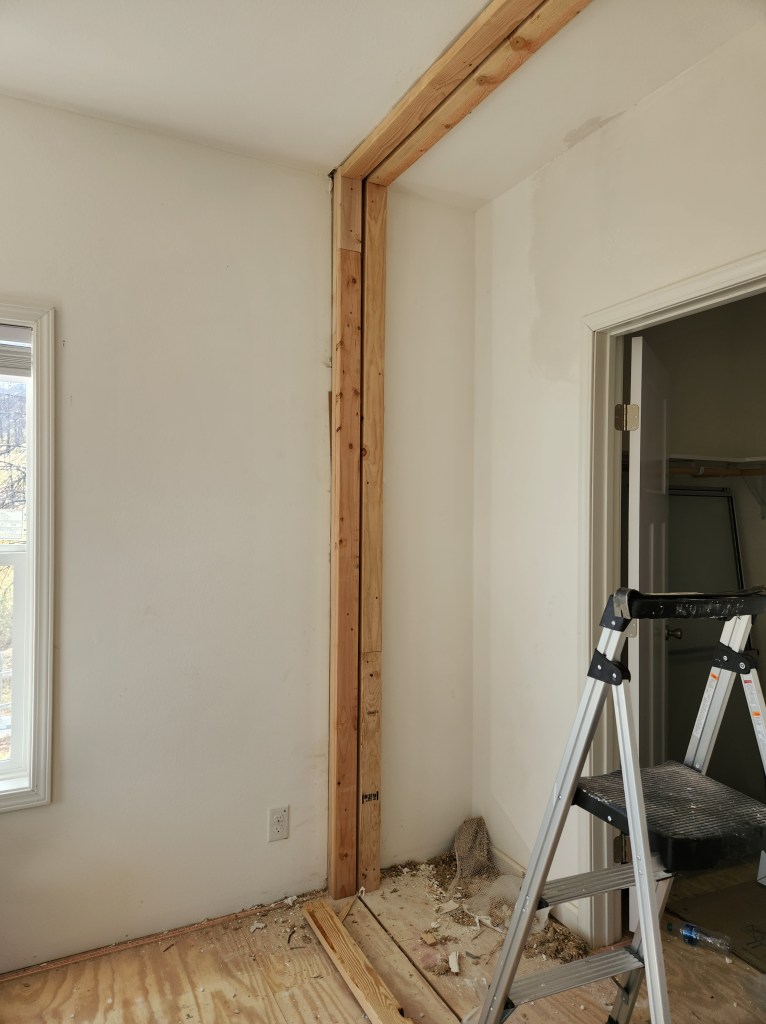When the finishing crew began to seal and drywall the seams where the halves meet, they discovered the walls did not meet flush. We can’t determine if the problem happened because the house sat on the sales lot for so long, almost tumbled off the mountain, or if the set crew was in a rush. So, the finishers and warranty manager came up with a solution, while not the ideal, at least makes the offset invisible. They are boxing the joints and adding drywall. I talked to the warranty guy at the sales office, and he agreed that it’s the best solution without messing with any weight-bearing structure.