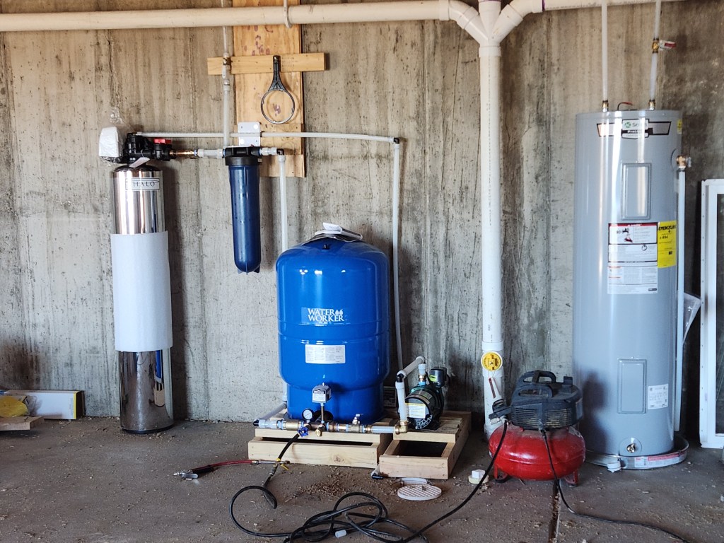 On Wednesday, we turned on the water system. The cistern started filling, so we left it alone. Unfortunately, we needed to add a jet pump to increase the pressure into the house enough to keep the pressure tank full. Then we learned our well might still be low-producing. By Thursday, we still didn’t have enough water to fill the system to check for leaks. It took one of us going up the mountain on Friday to learn that the cistern wasn’t filling like we had hoped it would. So, we called one of the mountain water providers to drive up with a truckload to fill the cistern.