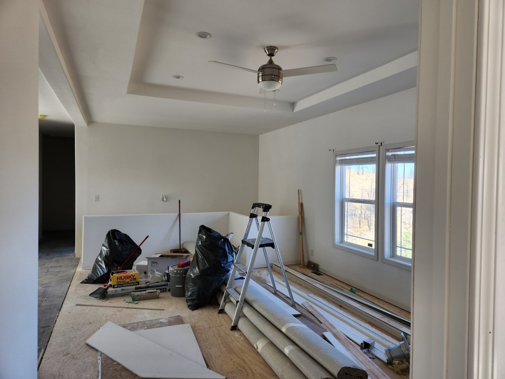 The inside is almost complete. The drywall repairs are done, and the walls painted. Ceiling fans are up in all the rooms. I think all they need to finish inside is to lay the carpets in the living room and bedroom. After that, there is a bit of outside work that still needs doing, but according to the lead on that job, he’s waiting for replacement material. Once he gets that, he’ll be able to finish repairs to the siding and eaves that were damaged during transport.