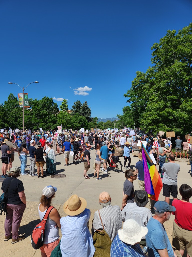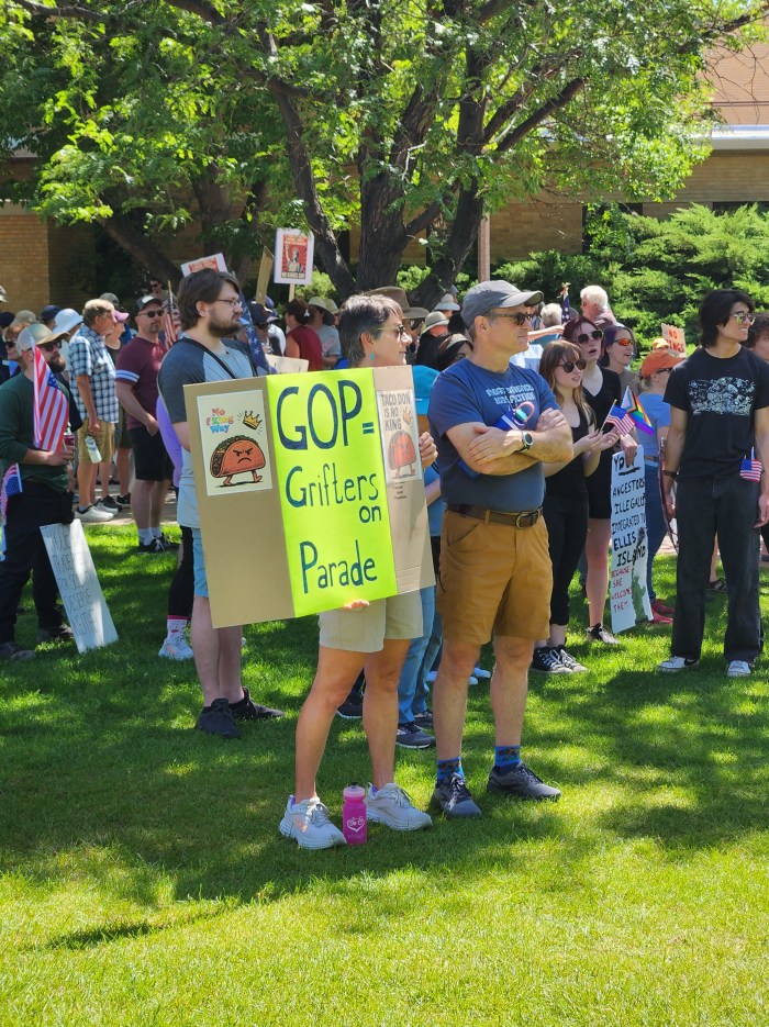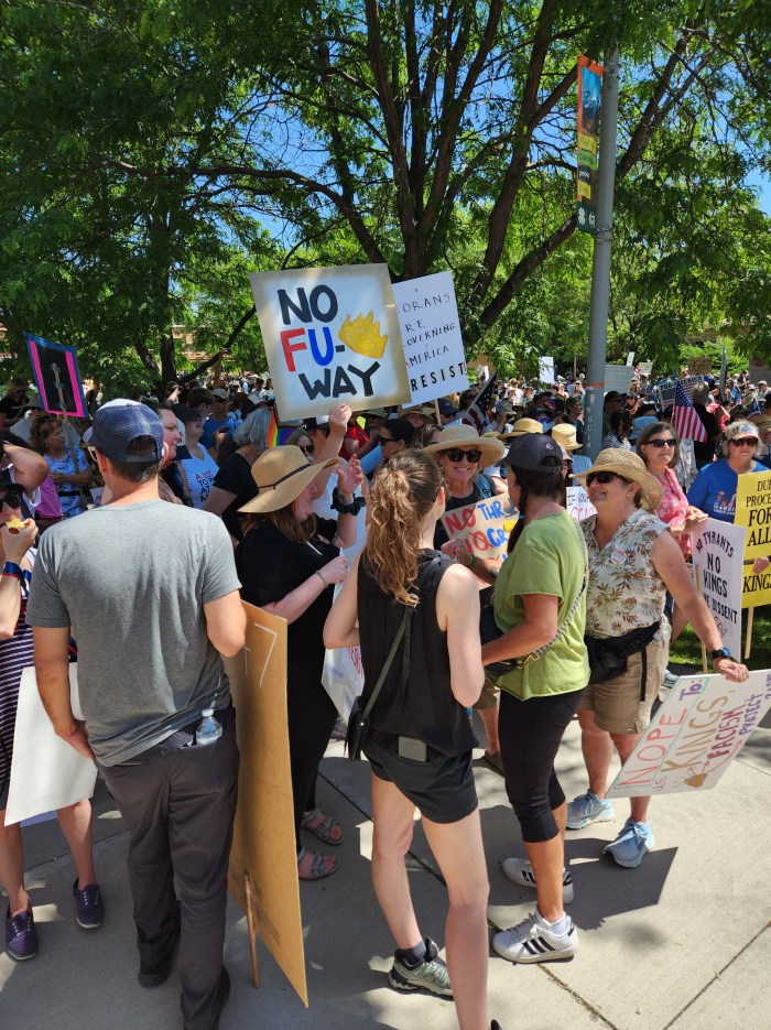 Once more, First Reader and I took to the streets to protest against the insanity happening across the United States. Like the last few protests, we stayed local once again. Unlike the Hands Off march in early April, we certainly didn’t have to bundle up for the cold. The weather was quite the opposite, in fact. By the time we left the rally, temperatures had crept into the low 90s F. We broke out sunscreen instead of layers.